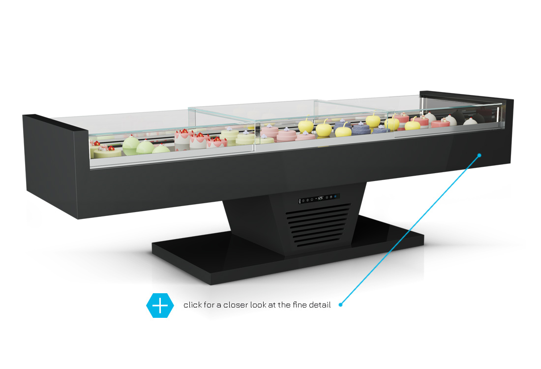 La vitrine CARAMEL CENTER se distingue dès le premier regard. Son design progressif est l'une de ses caractéristiques les plus distinctives. Les cristaux en cascade offrent au client la possibilité unique d'avoir une vue pratique du produit sur les quatre côtés.